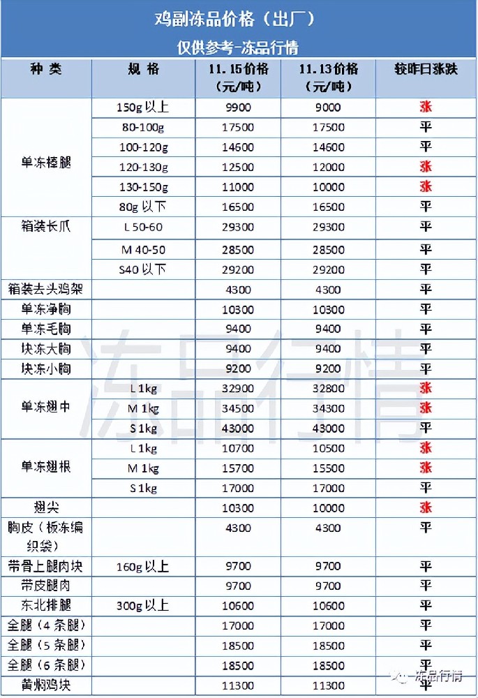 今日進(jìn)口和國產(chǎn)雞副凍品價(jià)格開漲!巴西、美國和阿根廷等爪類漲300-500元/噸!國產(chǎn)分割凍品中重大規(guī)格棒腿和翅中、翅根等漲100-200元/噸左右,部分廠家拉漲動(dòng)作明顯!速看下方表格↓↓↓